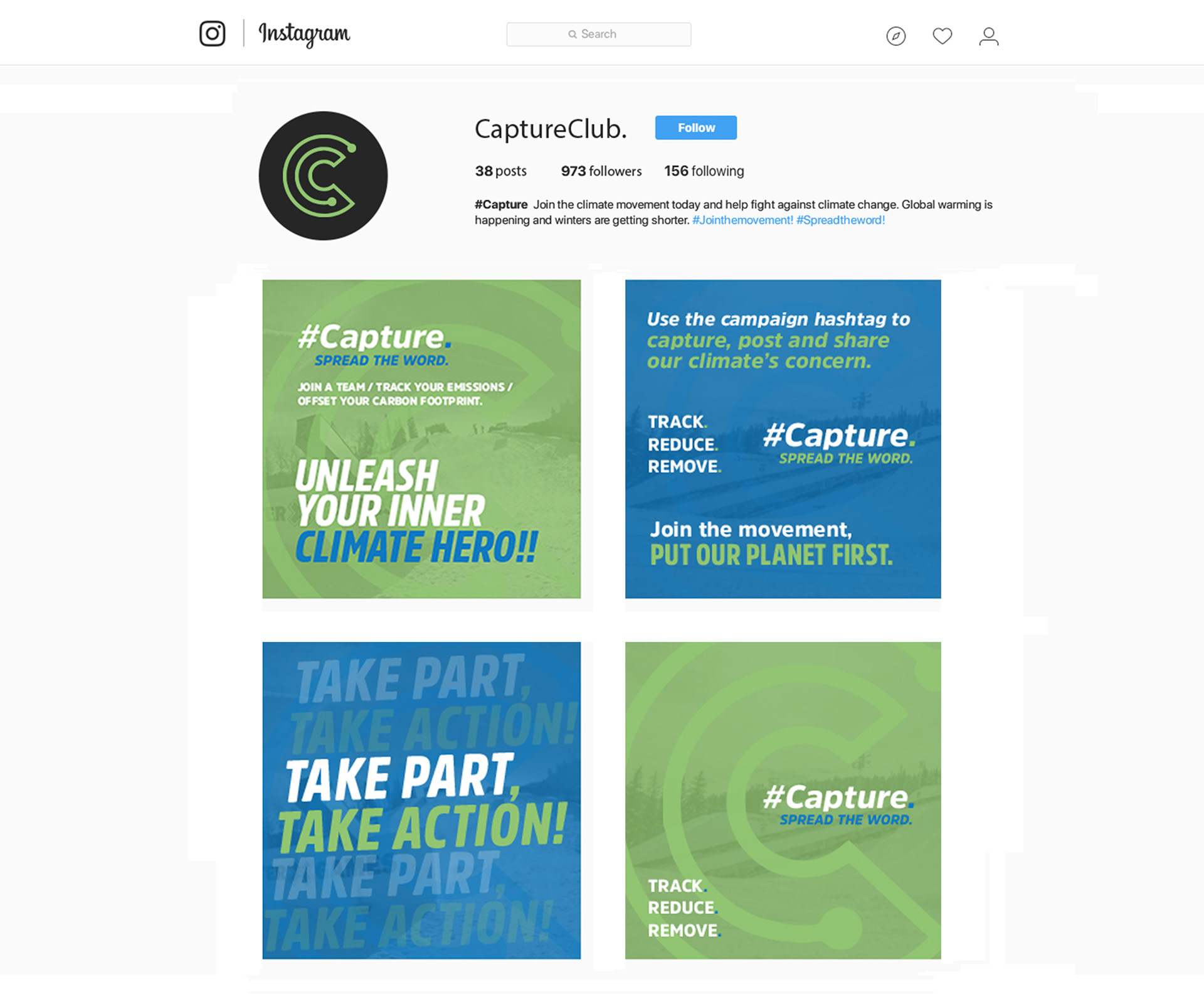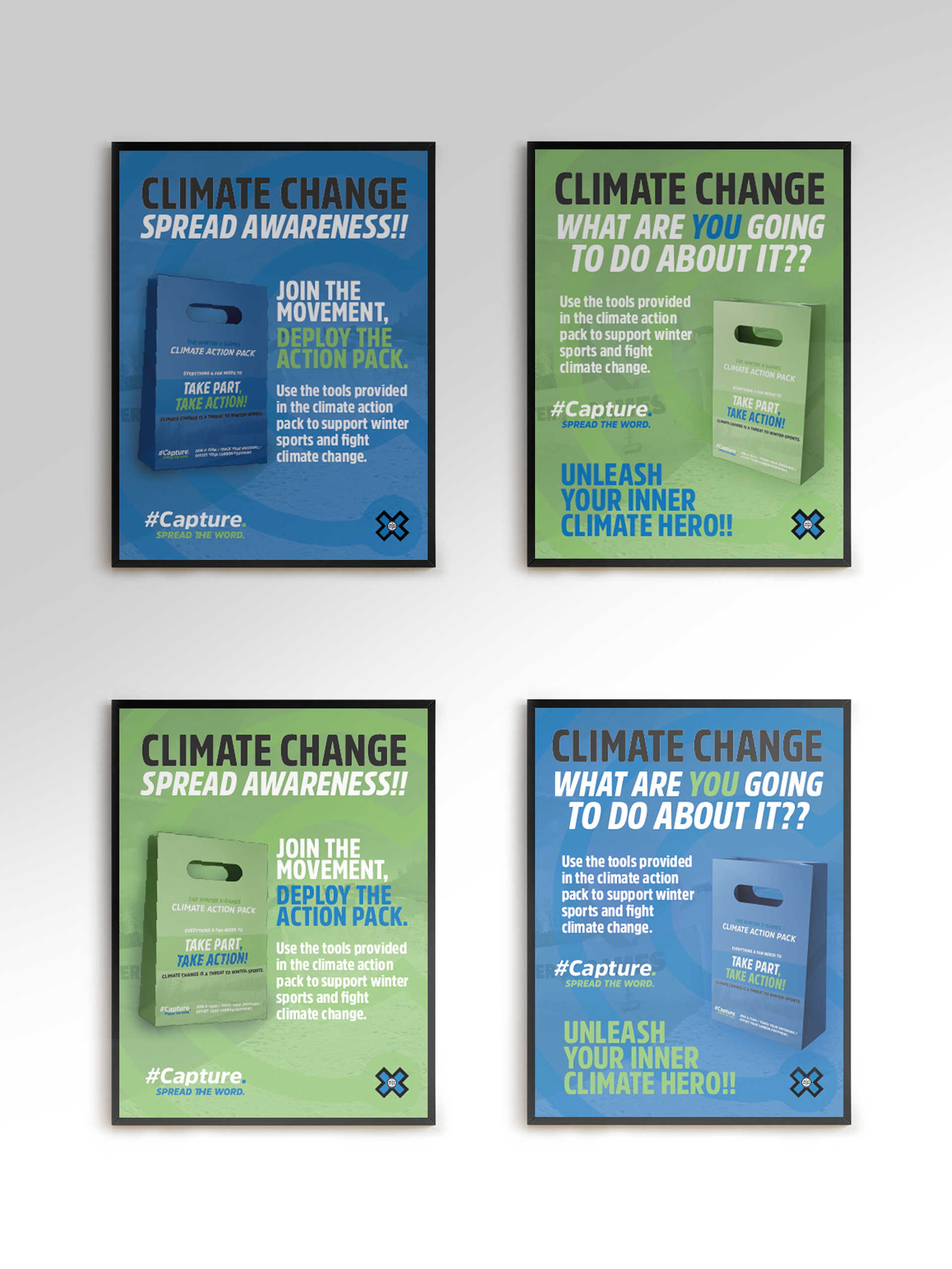 The task for this project was to produce a guerrilla marketing campaign to encourage sports fans to take action against climate change. #Capture is a campaign aimed towards winter-sports fans, more specifically, Winter X-Games fans in order to inspire action against the issue and to join the climate movement. A series of banners and posters are designed and will be displayed around events, resorts and social-spaces.