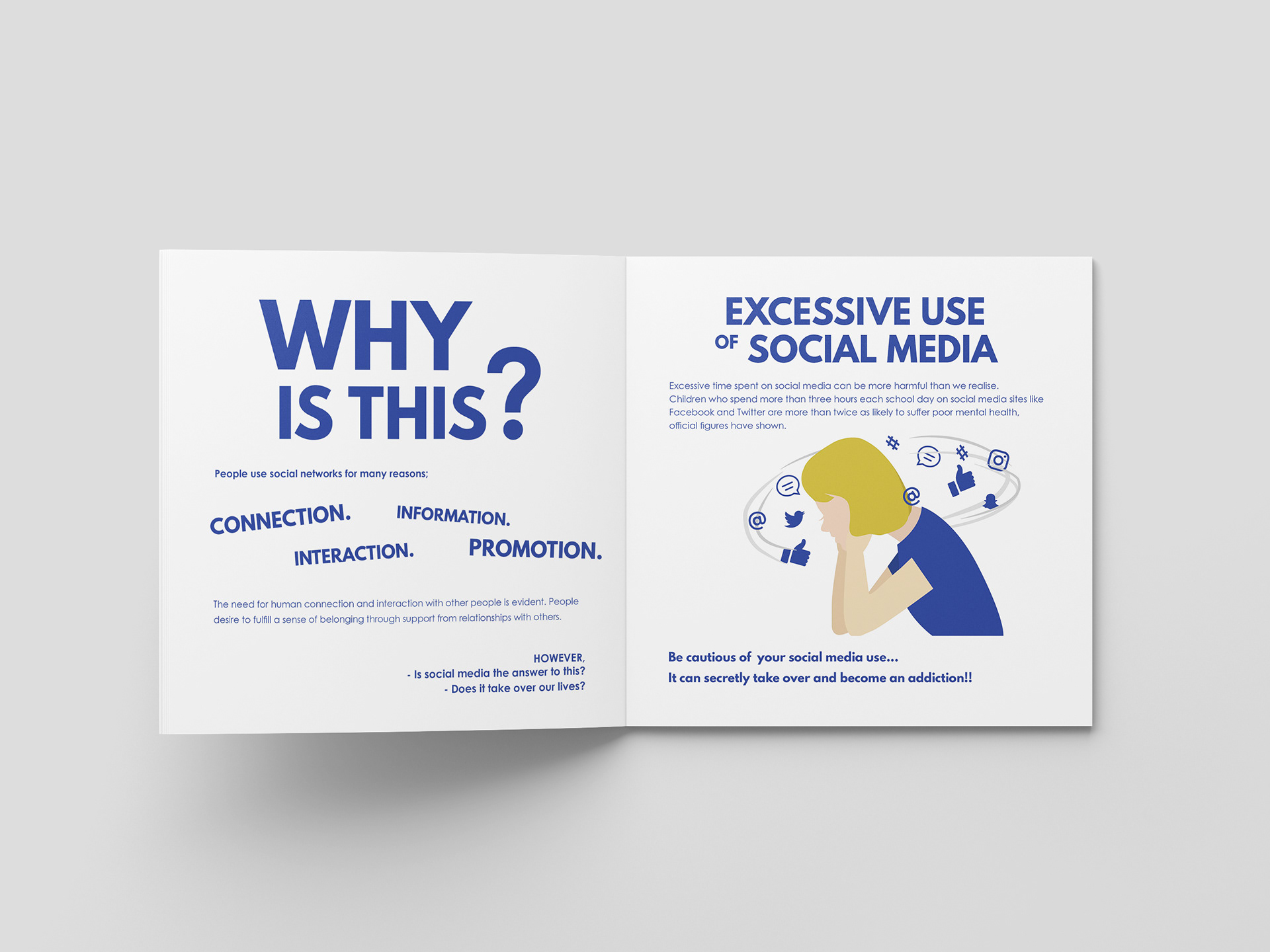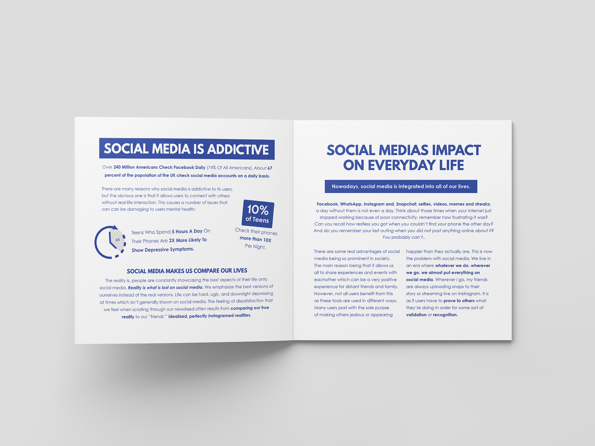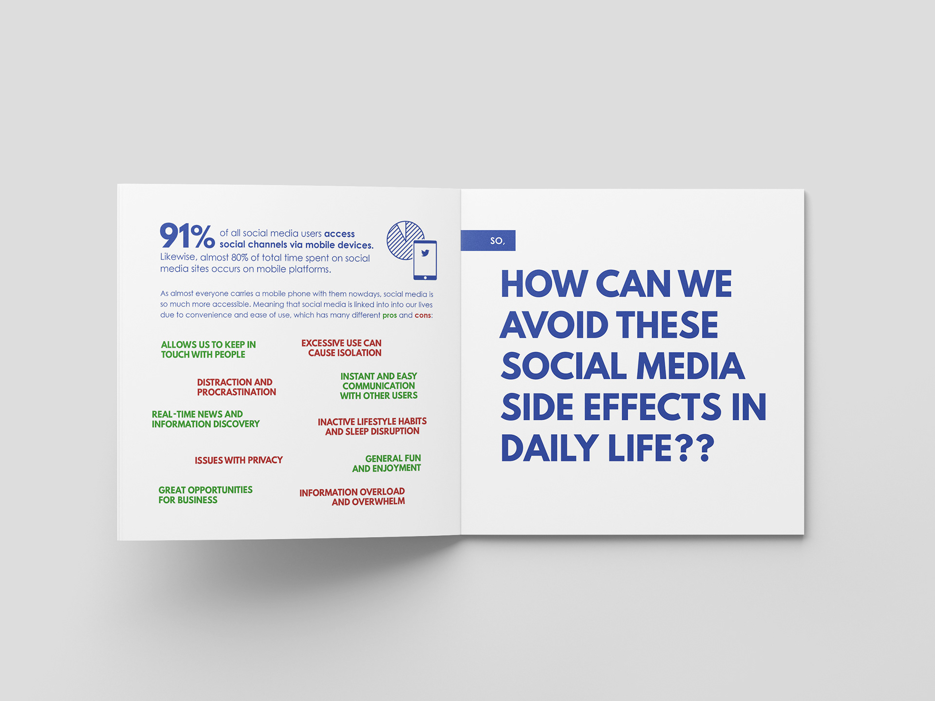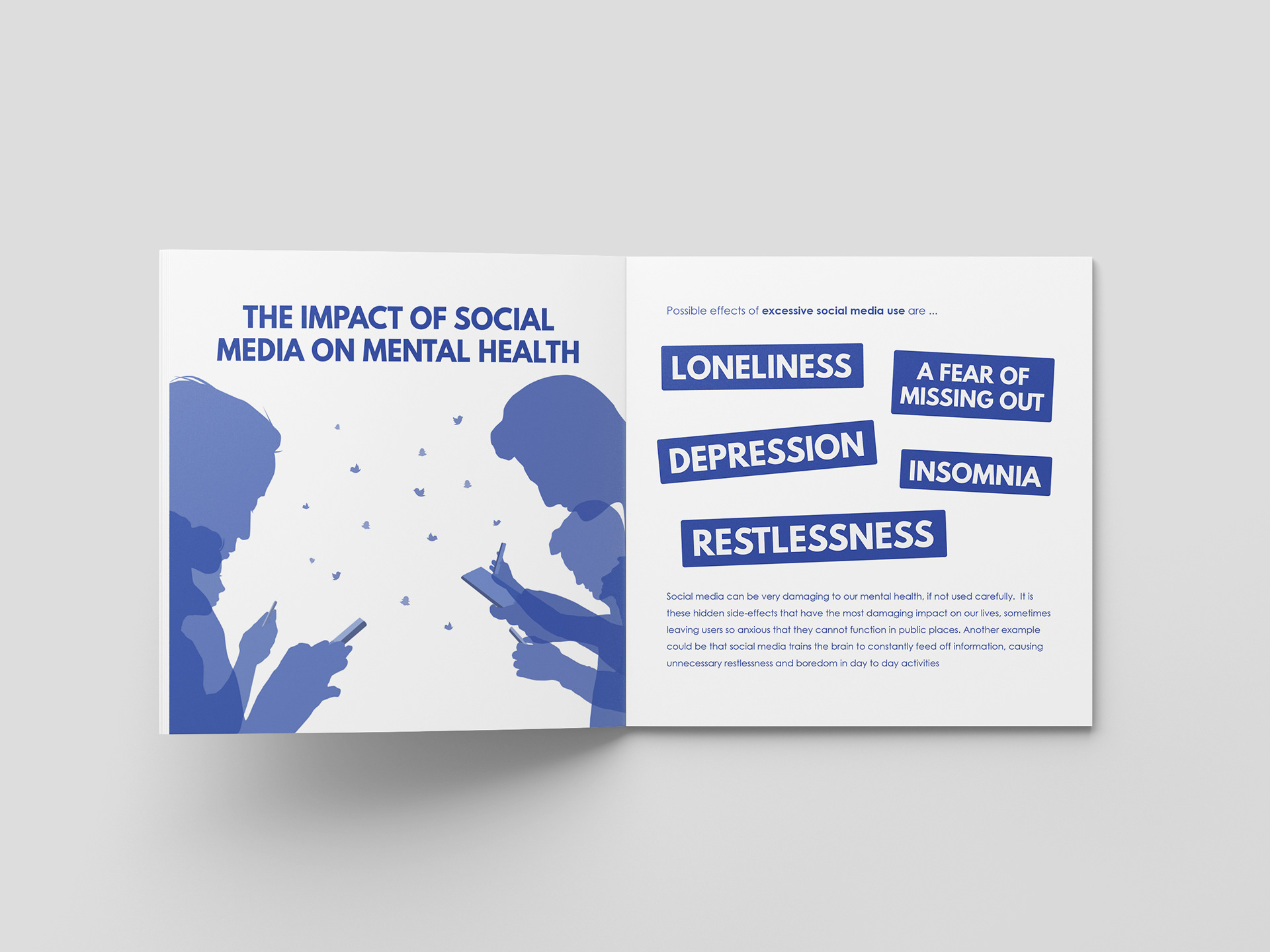 Reasons for choosing this topic are that recently there has been a massive increase in social media use, and nobody really understands the implications of it. There are many hidden impacts that social networking can have on users’ mental health e.g. Loneliness, Insomnia, Depression, Anxiety, etc. which is one of the main reasons for producing this zine.