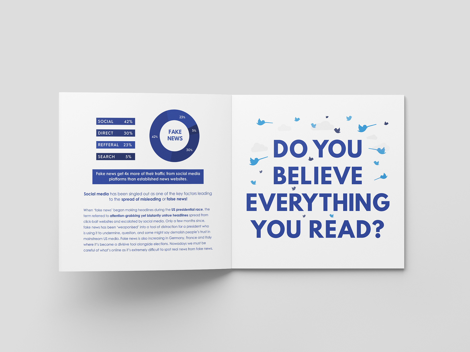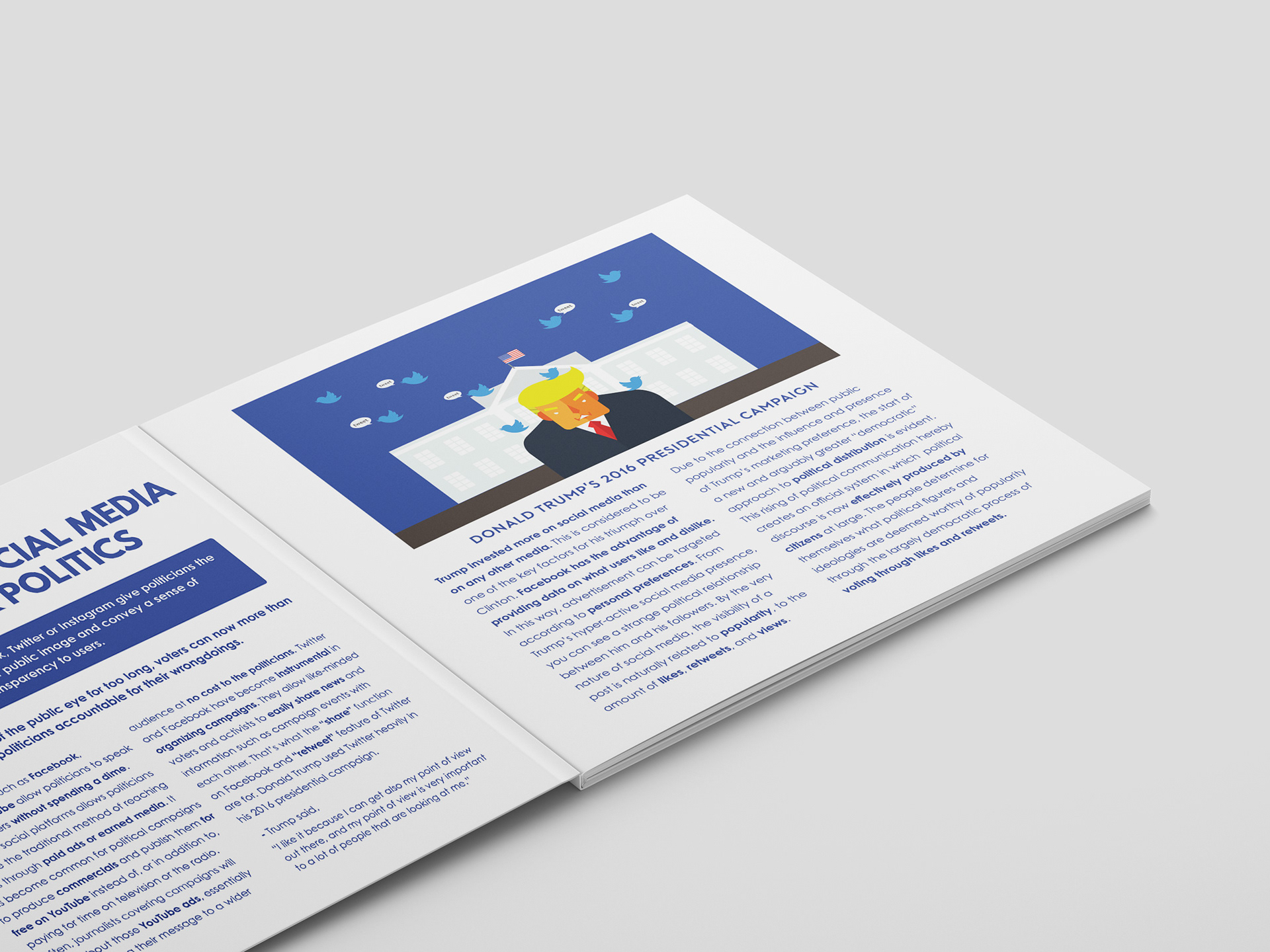 The colour scheme chosen is blue and white, as it relates to the 2 main social platforms Twitter and Facebook, which has been kept consistent throughout the zine.
