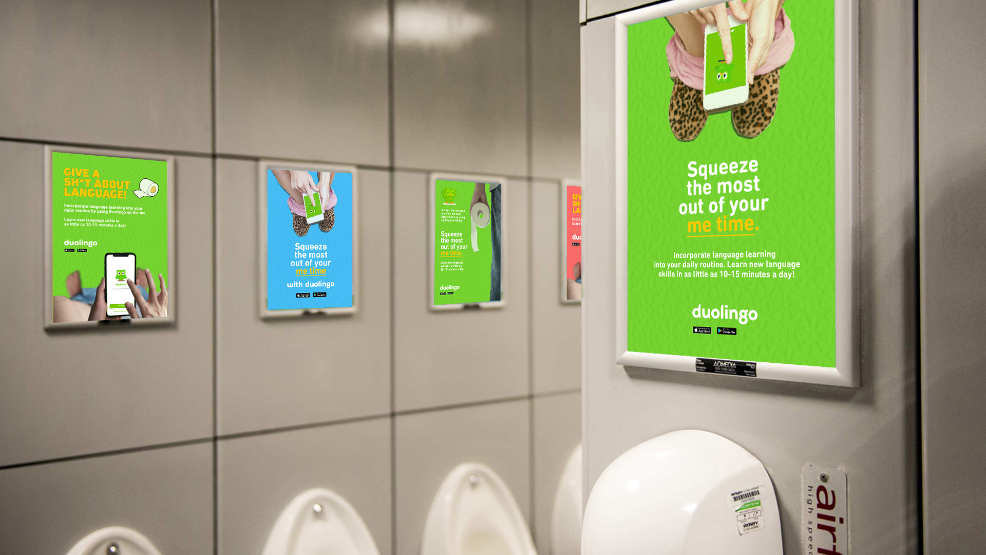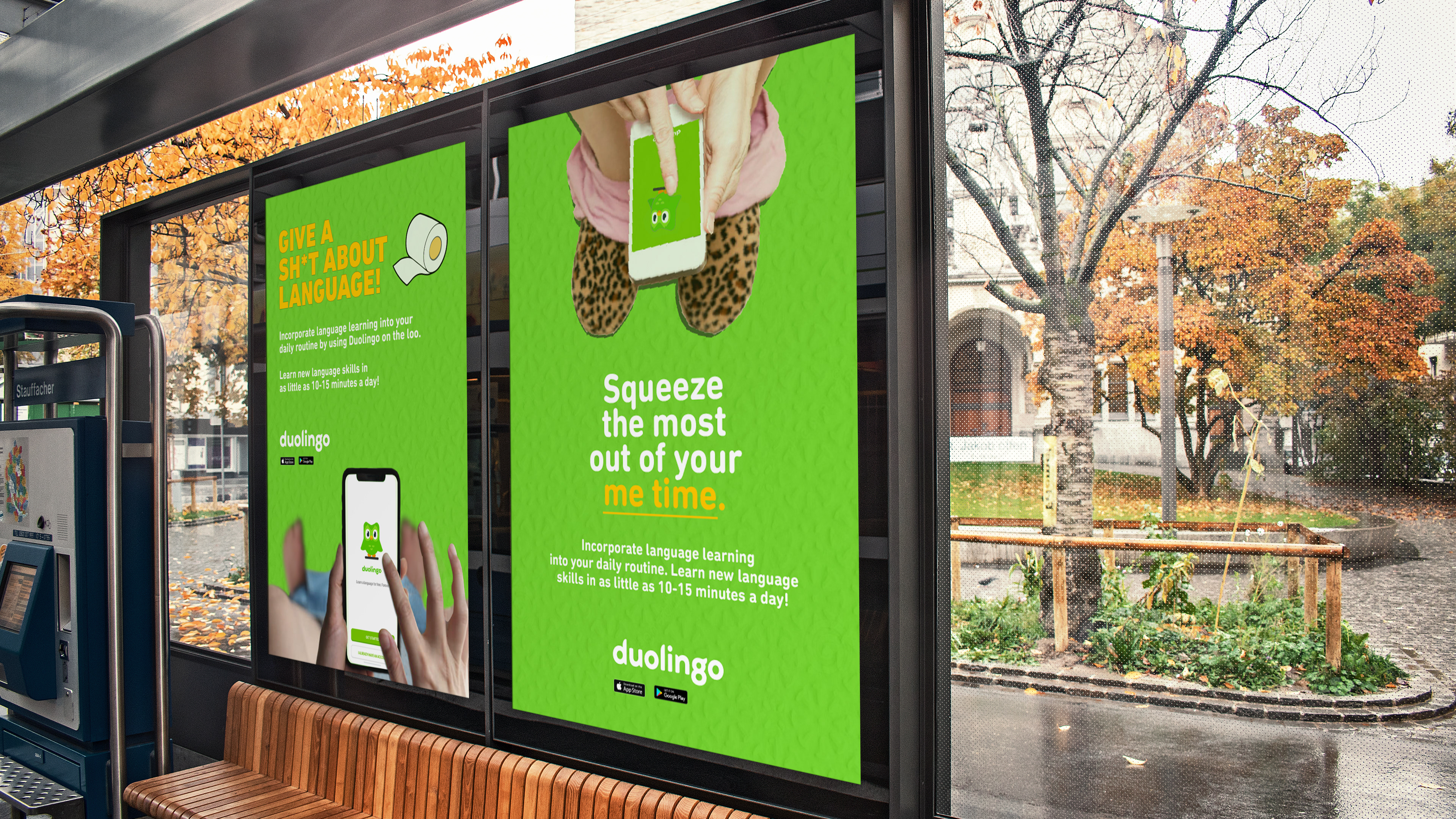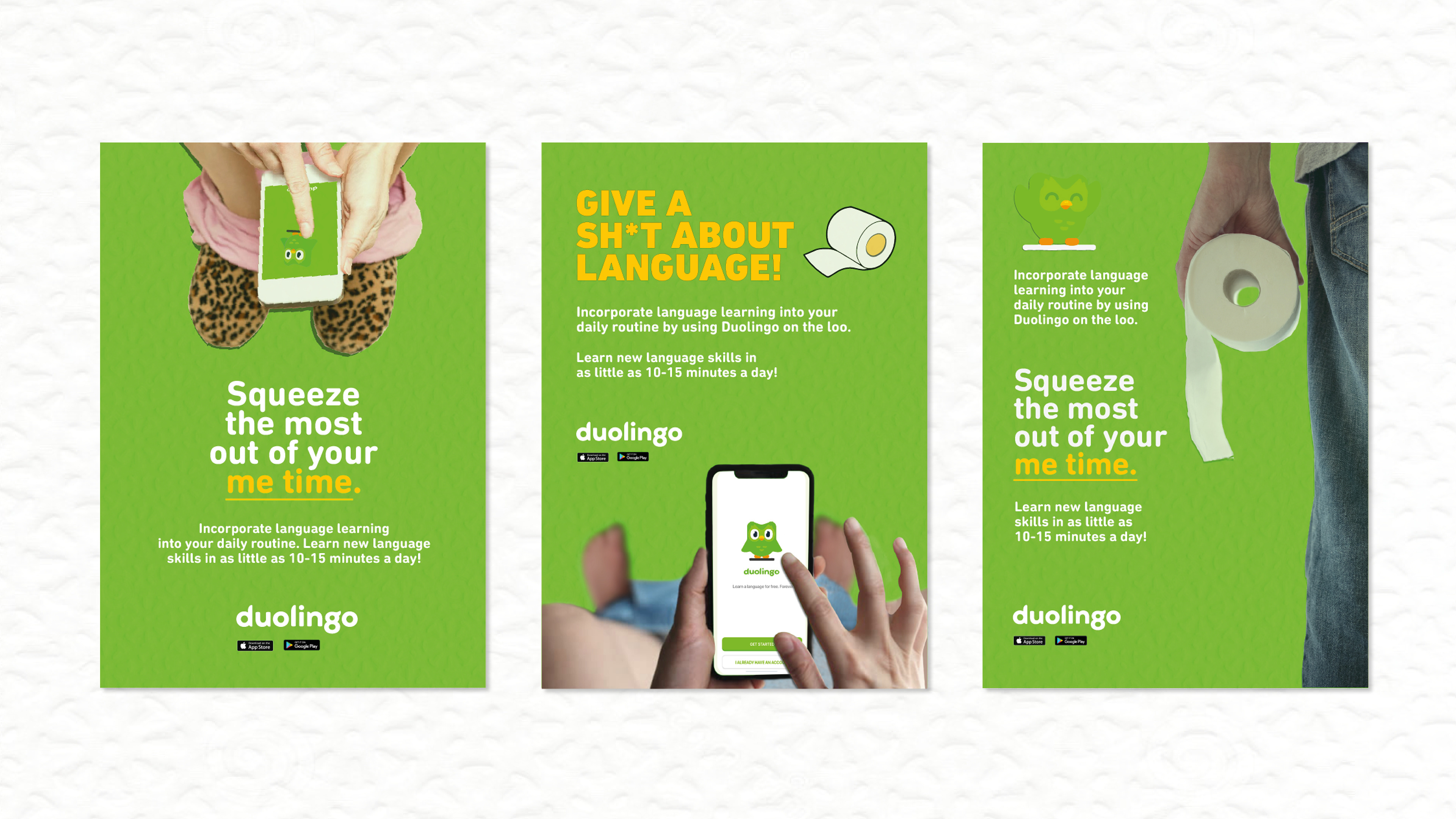 Give a sh*t about language is all about encouraging young adults aged 16-22 to use Duolingo whilst on the loo and make the most out of their time. The campaign uses posters, social media and other promotional materials to engage the audience with Duolingo.