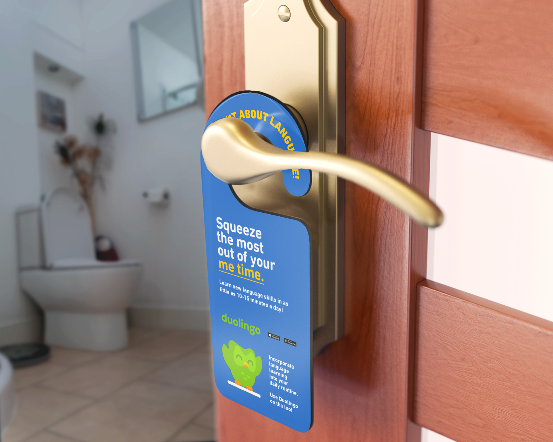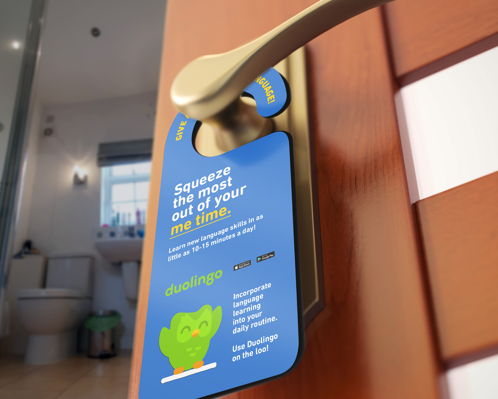 This door hanger design is to be placed on the handles of toilet doors and cubicles as a way of making the audience act there and then, during their “me time”. They can also be used as a marketing stunt for events, talks and so on, which could be handed out to the attendees. The aim is for people to engage with the campaign, download Duolingo and hopefully pass on or spread the word to someone else.