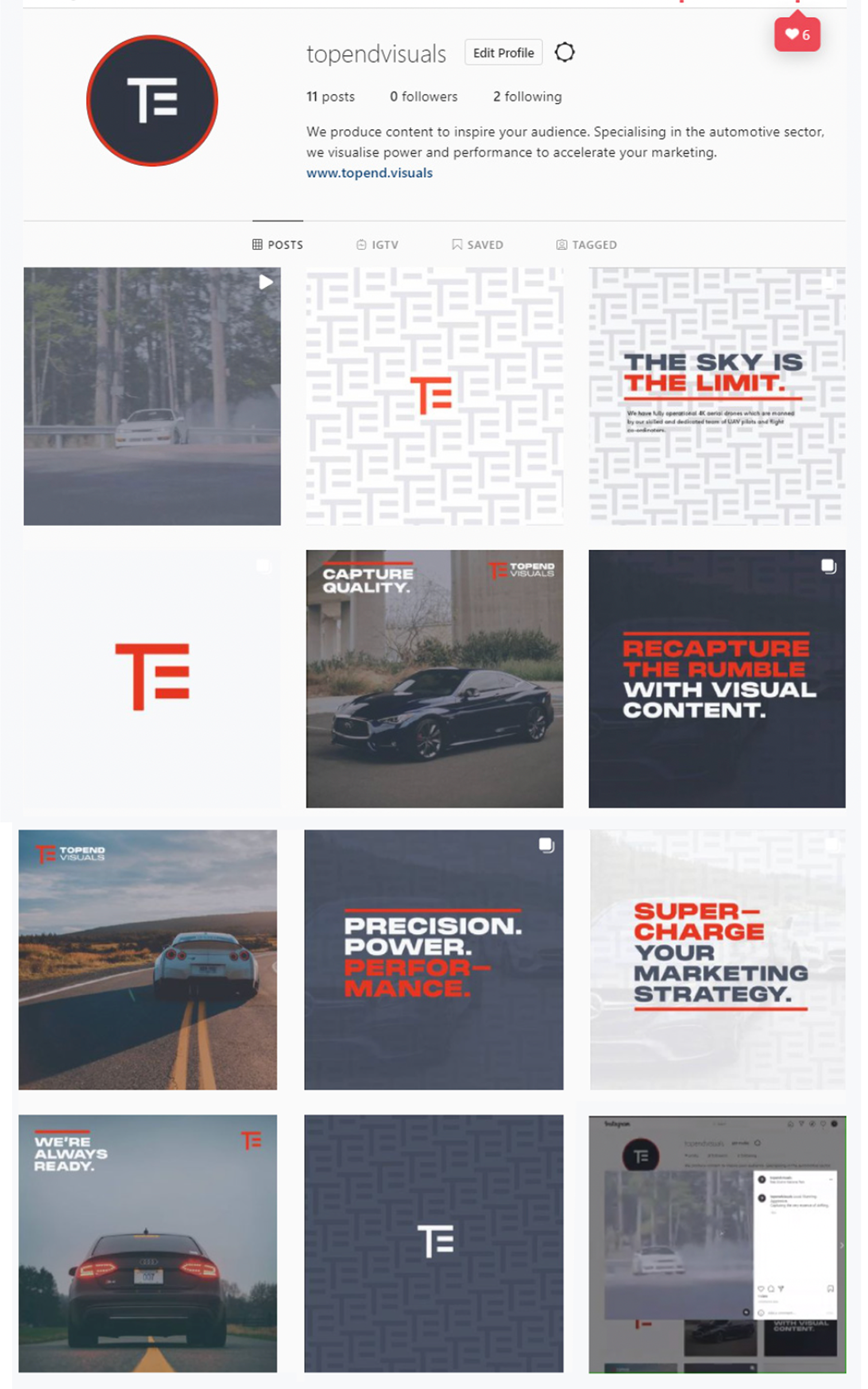 Today, social platforms are one of the most effective marketing tools for gaining recognition within an industry. The TopEnd Visuals social media presence is an essential element of the brand. Along with the website, their social page represents the brands digital existence. A series of video-posts have been produced to more effectively represent the brand. https://www.instagram.com/topendvisuals/